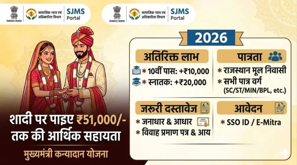 Mukhyamantri Kanyadan Yojana 2026: मुख्यमंत्री कन्यादान योजना 2026 का नोटिफिकेशन जारी कर दिया है इसमें सामाजिक न्याय एवं अधिकारिता विभाग द्वारा पात्र परिवारों कन्याओं या महिलाओं को 51000 रुपए तक की वित्तीय सहायता प्रदान की जाती है इस योजना का उद्देश्य गरीब परिवारों पर विवाह के आर्थिक बोझ को कम करना और बेटियों के विवाह को प्रोत्साहित करना है मुख्यमंत्री कन्यादान योजना के लिए आवेदन पूरी तरह से ऑनलाइन कर दिया है और राशि सीधे लाभार्थी के खाते में ट्रांसफर की जाएगी।